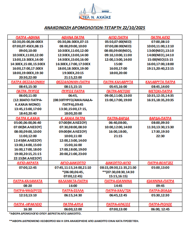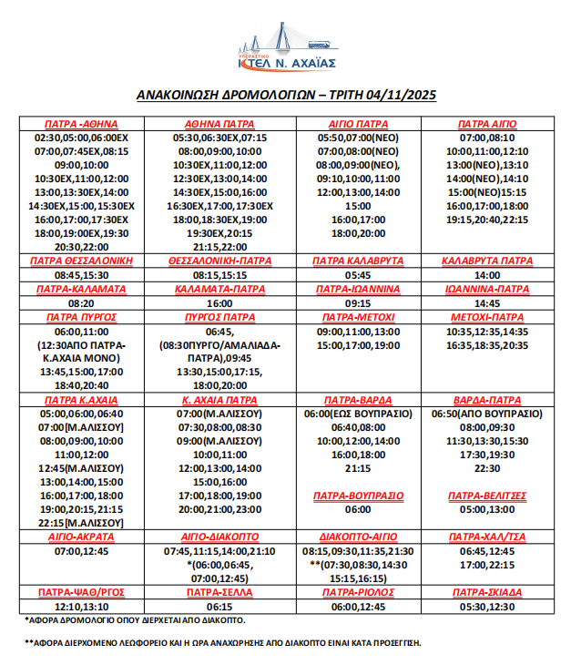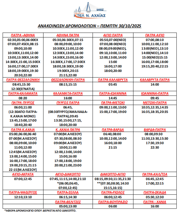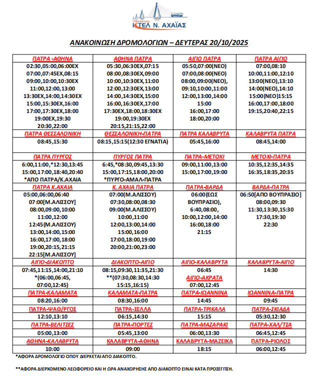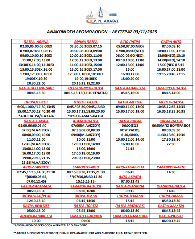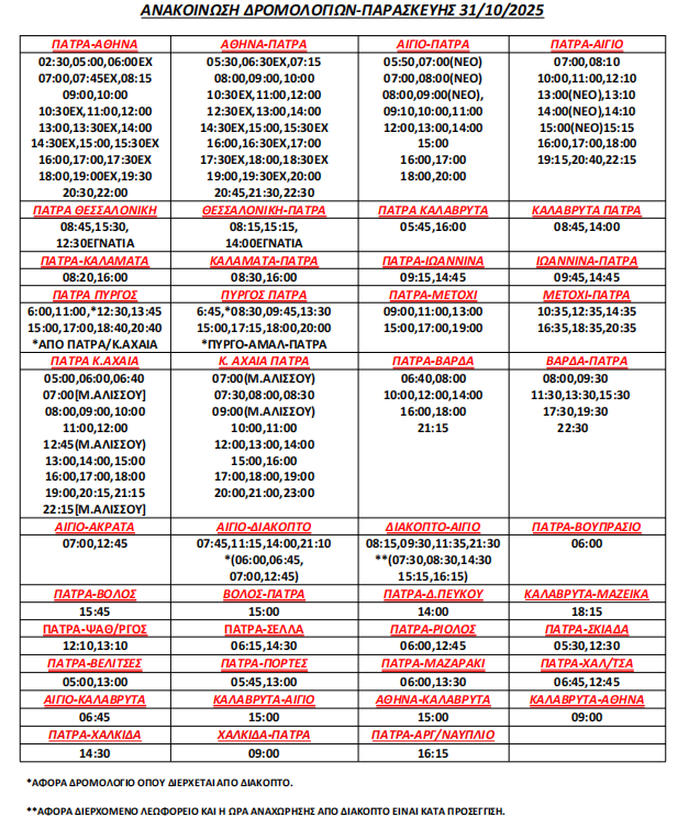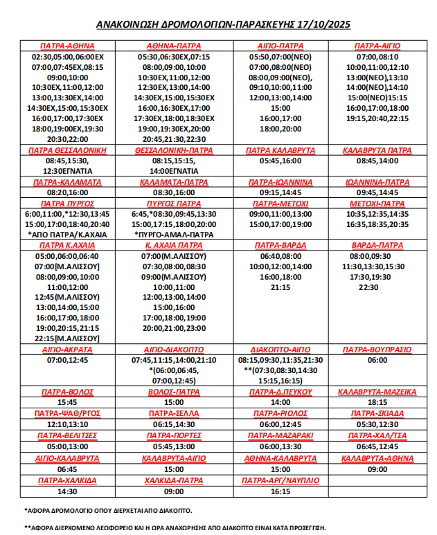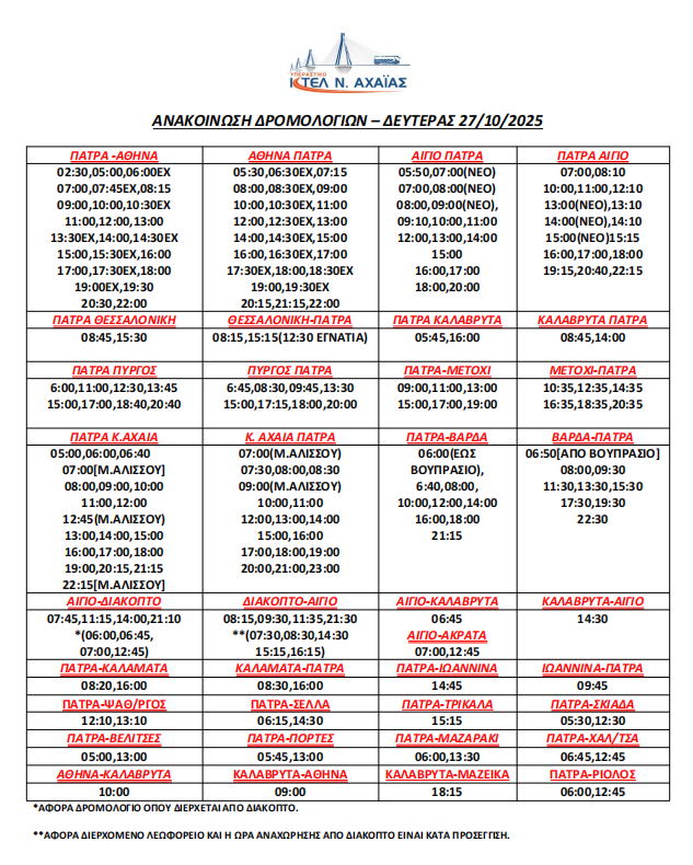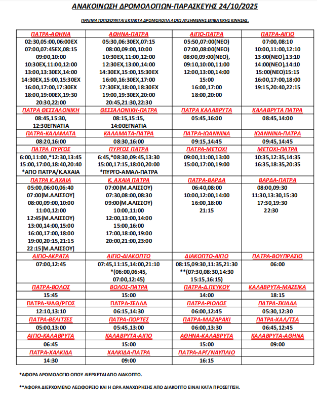 - * Τα δρομολόγια express (Πάτρα-Αθήνα, Αθήνα-Πάτρα) επανέρχονται συγκεκριμένες ώρες (βλ. καθημερινό πρόγραμμα)
