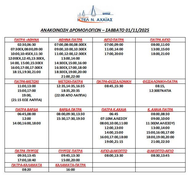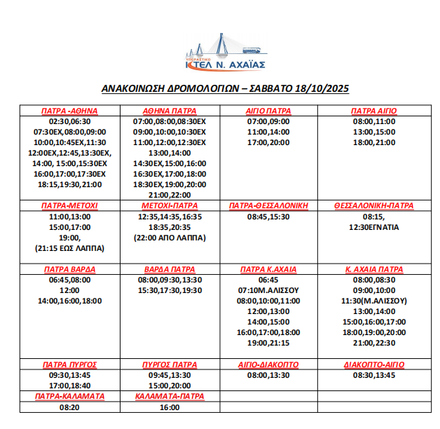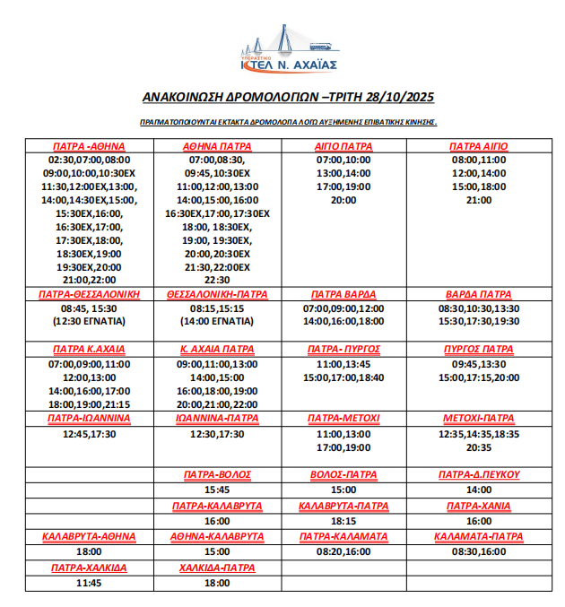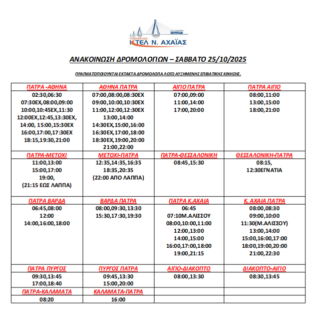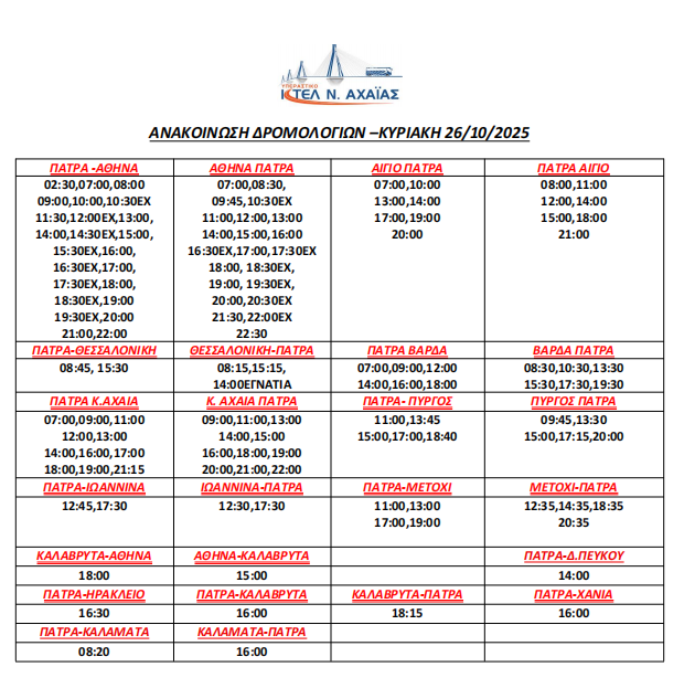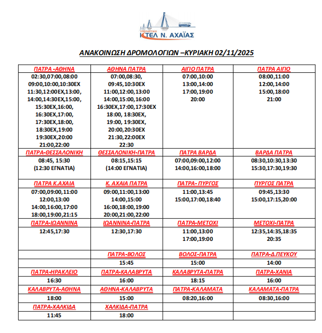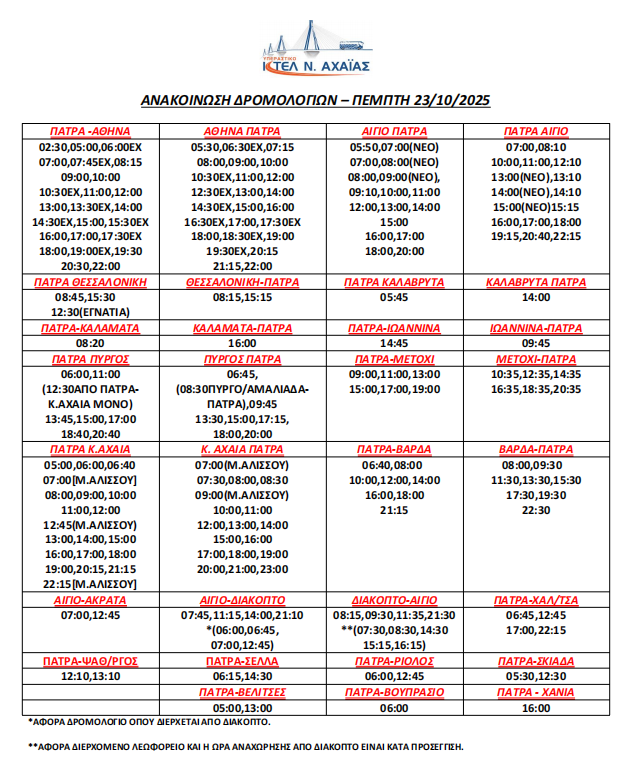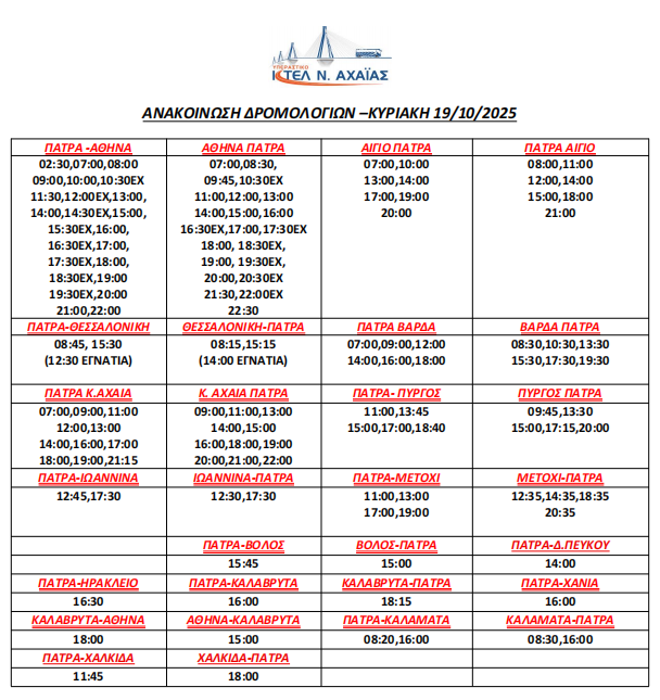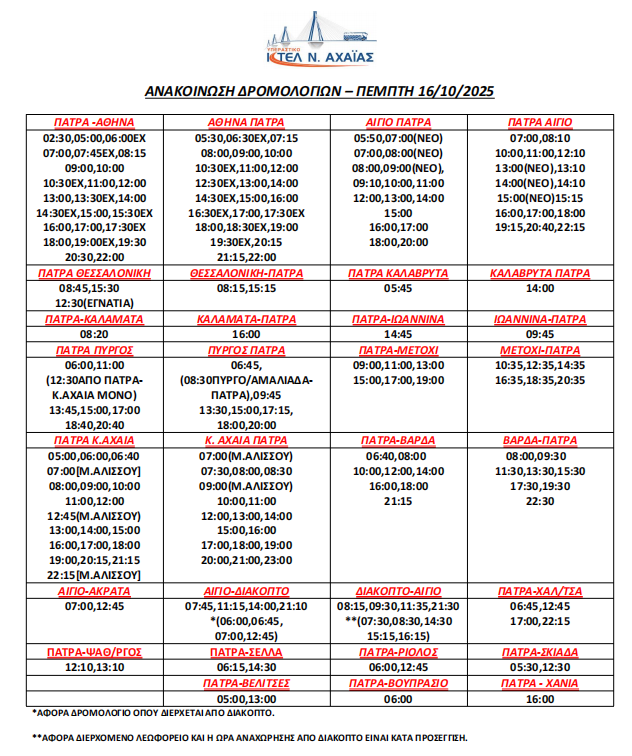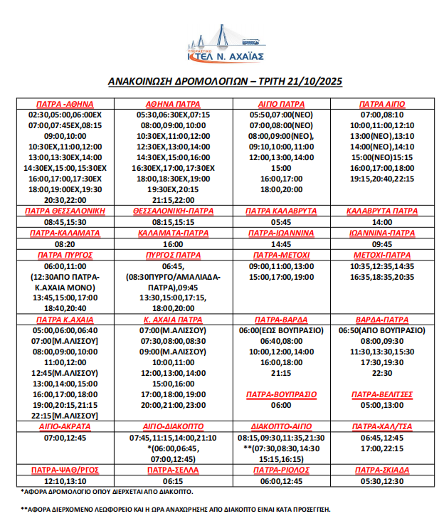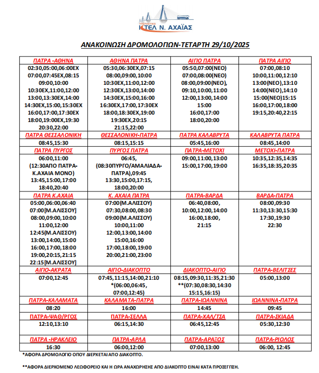 - * Τα δρομολόγια express (Πάτρα-Αθήνα, Αθήνα-Πάτρα) επανέρχονται συγκεκριμένες ώρες (βλ. καθημερινό πρόγραμμα)