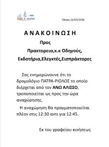 * Τα δρομολόγια express (Πάτρα-Αθήνα, Αθήνα-Πάτρα) επανέρχονται συγκεκριμένες ώρες (βλ. καθημερινό πρόγραμμα)
