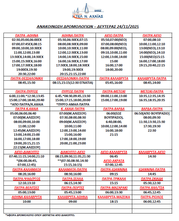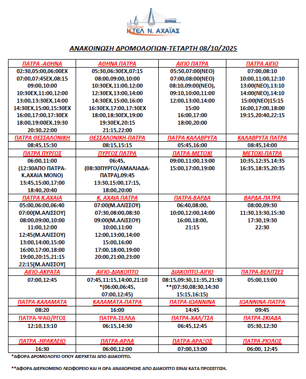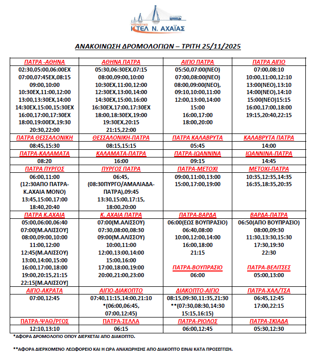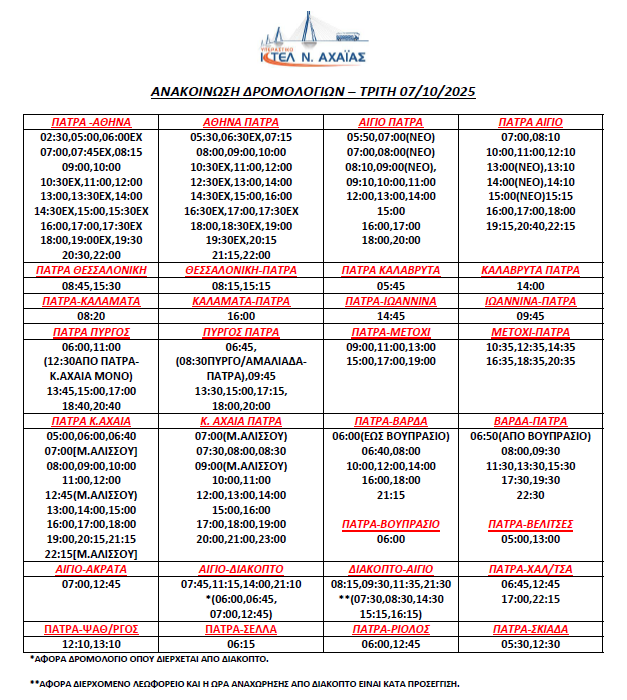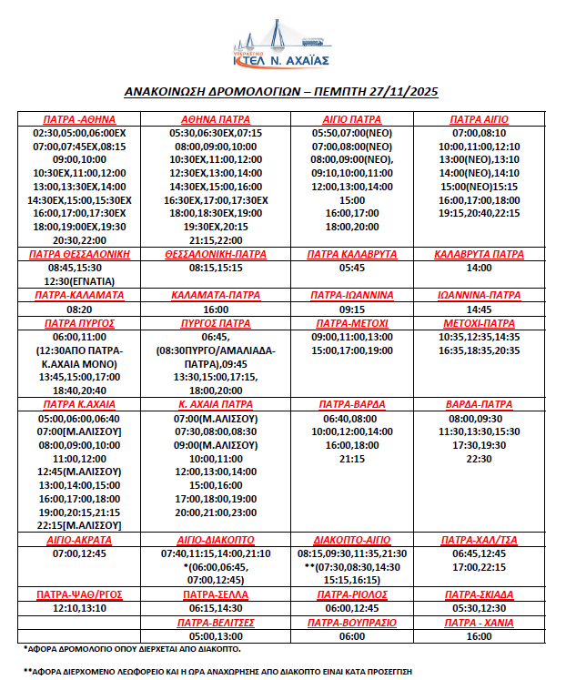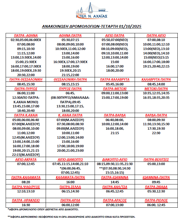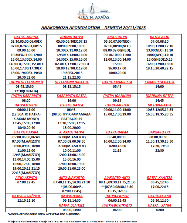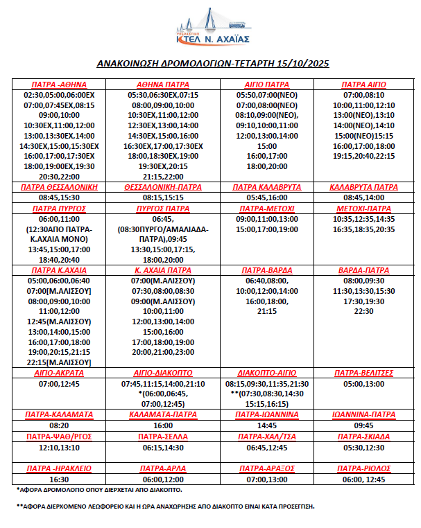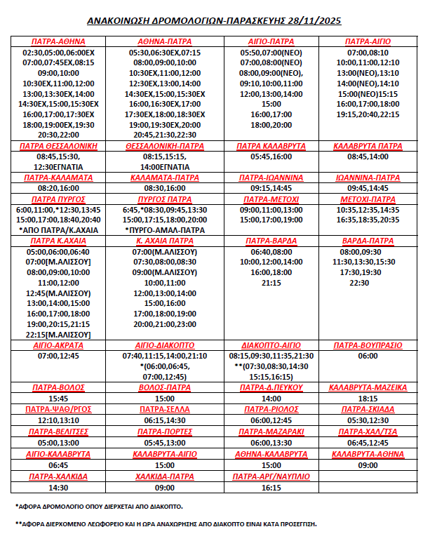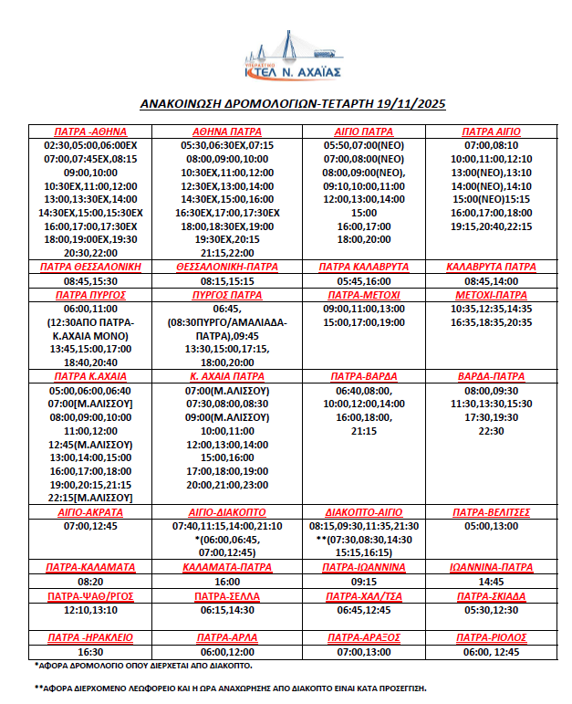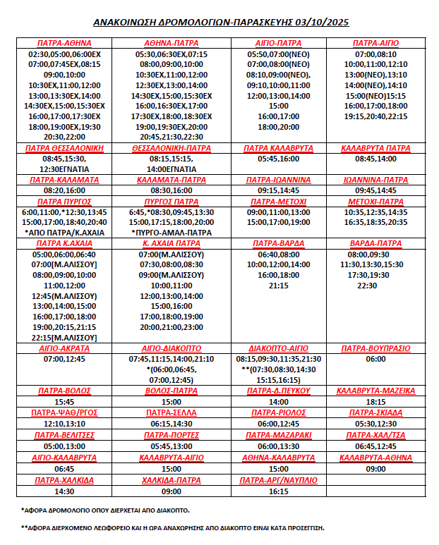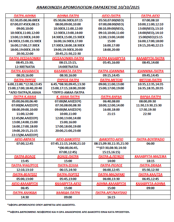- * Τα δρομολόγια express (Πάτρα-Αθήνα, Αθήνα-Πάτρα) επανέρχονται συγκεκριμένες ώρες (βλ. καθημερινό πρόγραμμα)