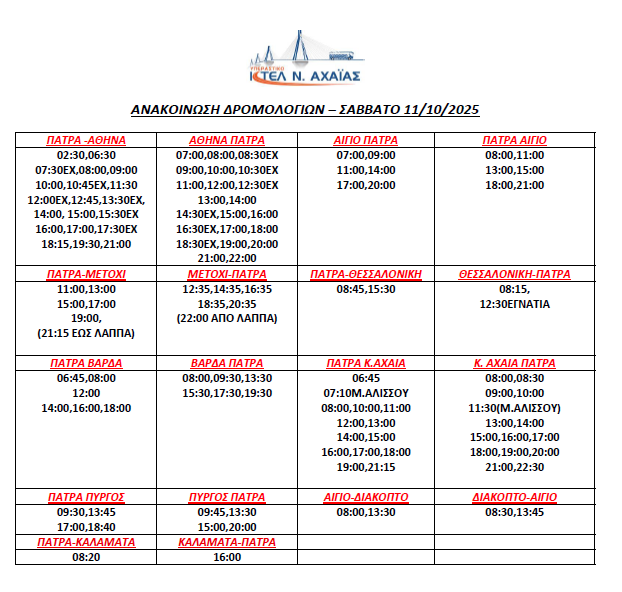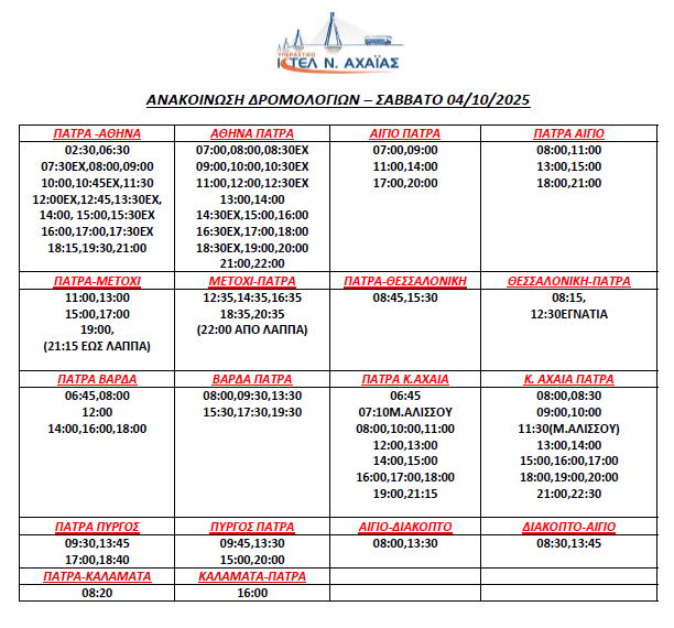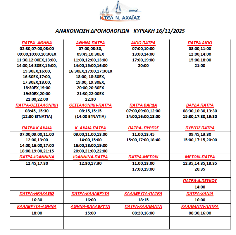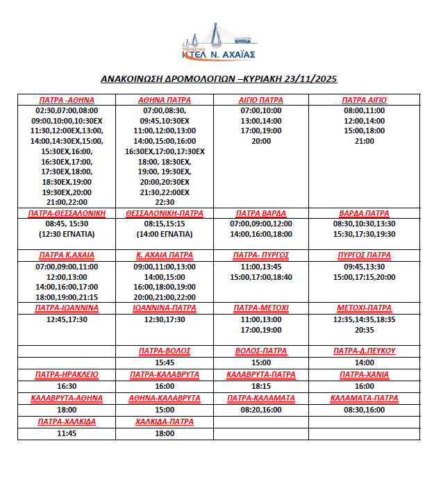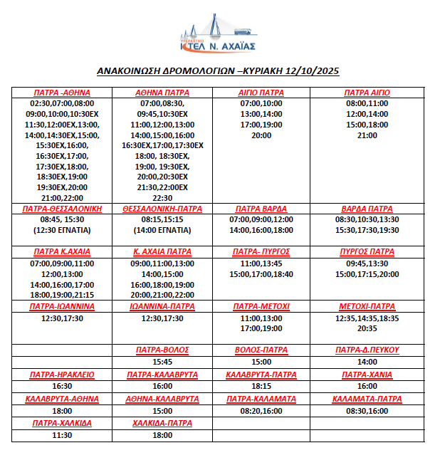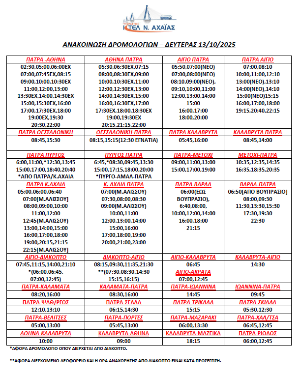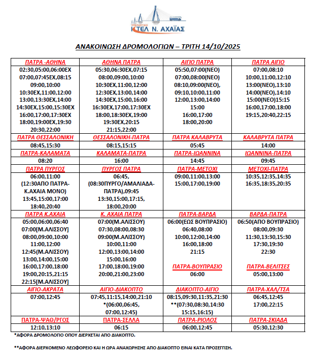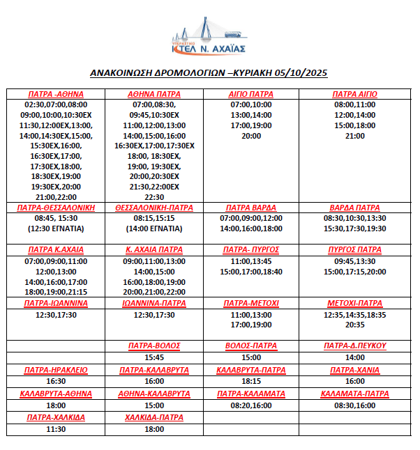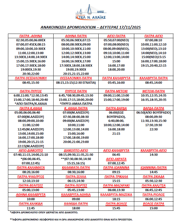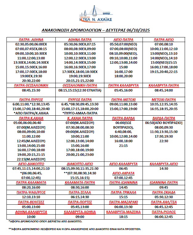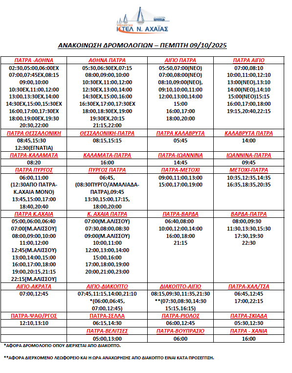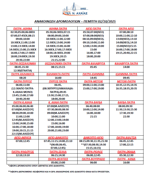 - * Τα δρομολόγια express (Πάτρα-Αθήνα, Αθήνα-Πάτρα) επανέρχονται συγκεκριμένες ώρες (βλ. καθημερινό πρόγραμμα)