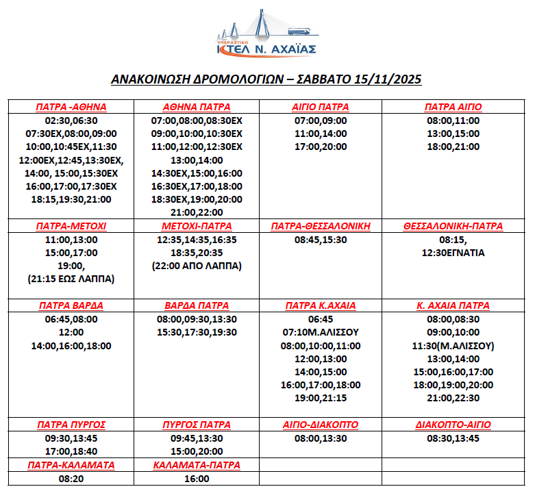 Τα δρομολόγια από 15/11 έως και 29/11 είναι τα ακόλουθα