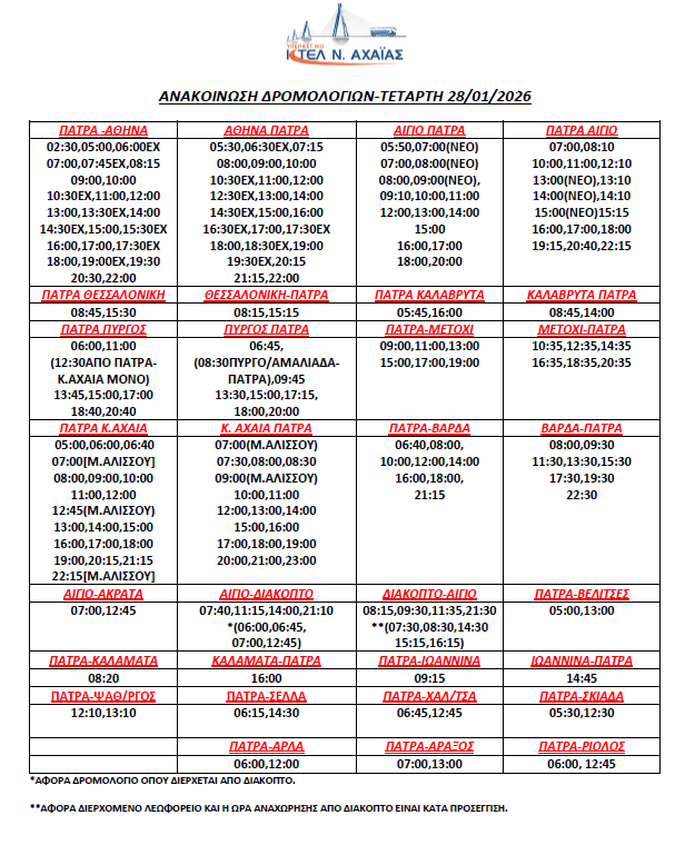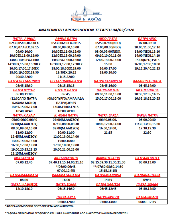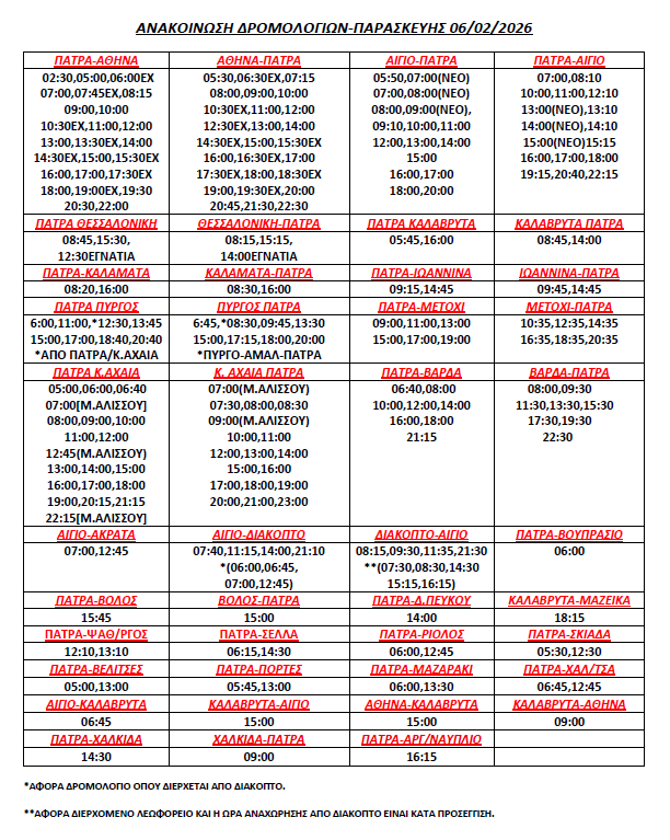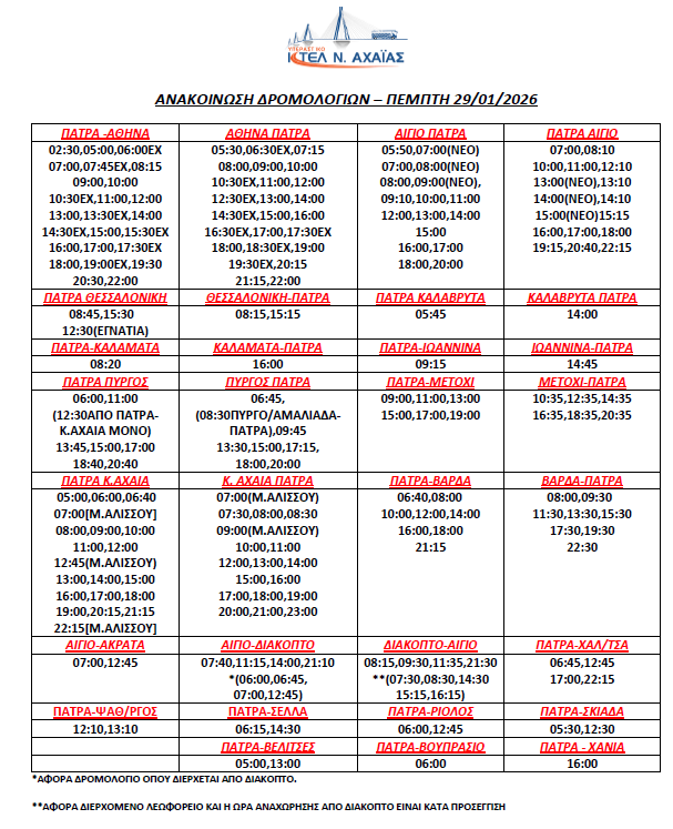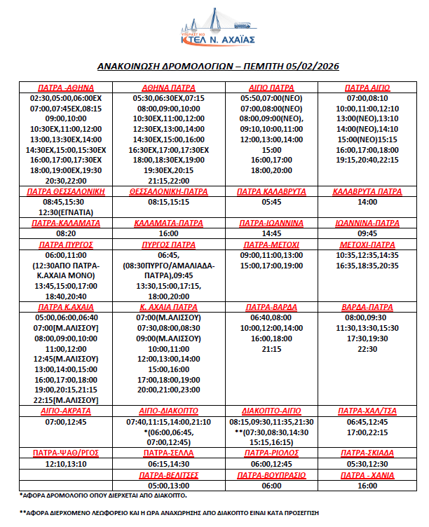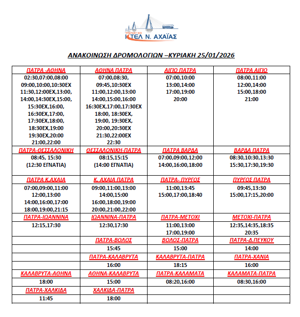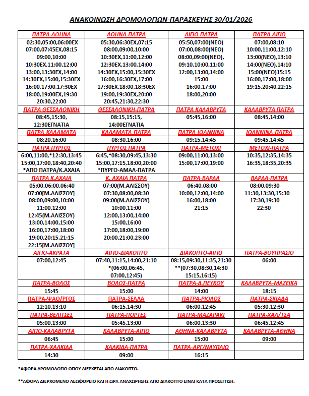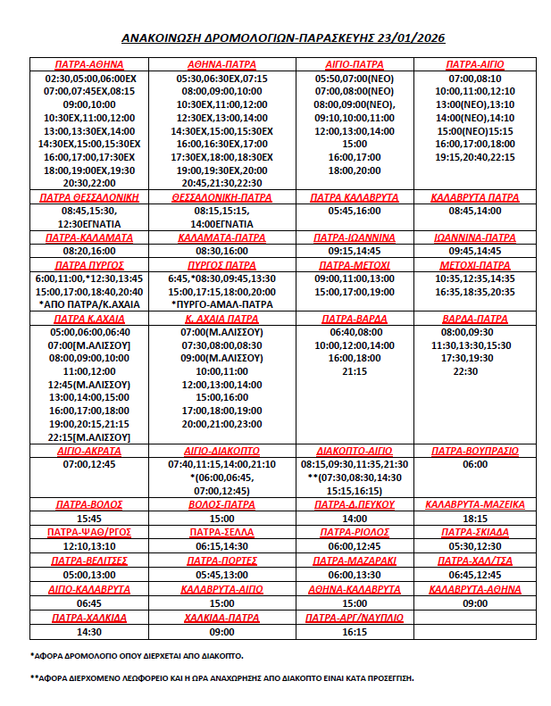 * Τα δρομολόγια express (Πάτρα-Αθήνα, Αθήνα-Πάτρα) επανέρχονται συγκεκριμένες ώρες (βλ. καθημερινό πρόγραμμα)