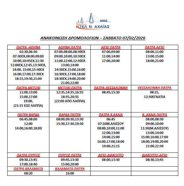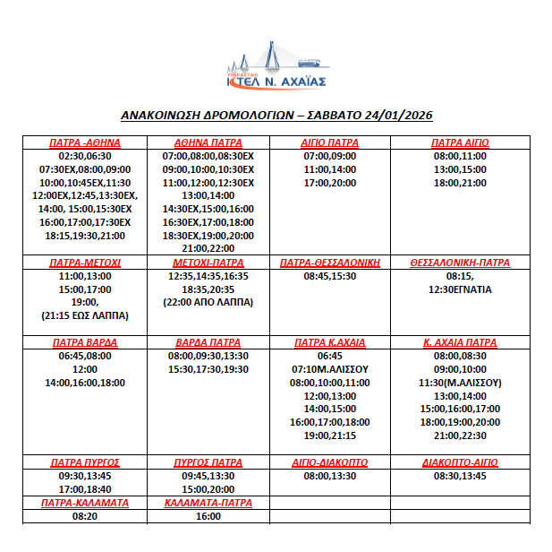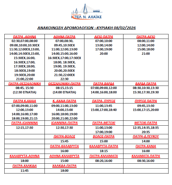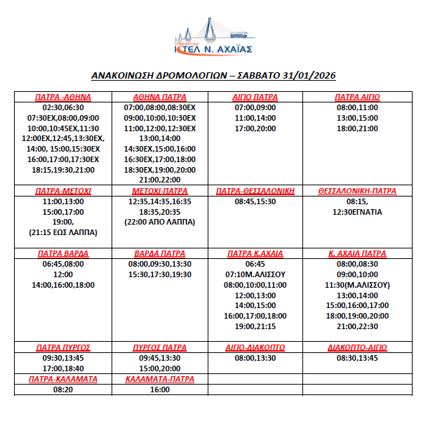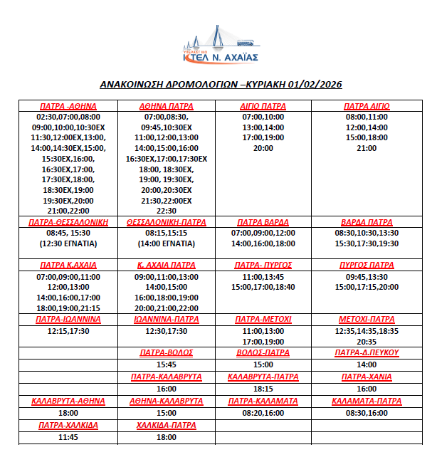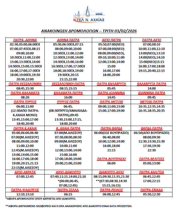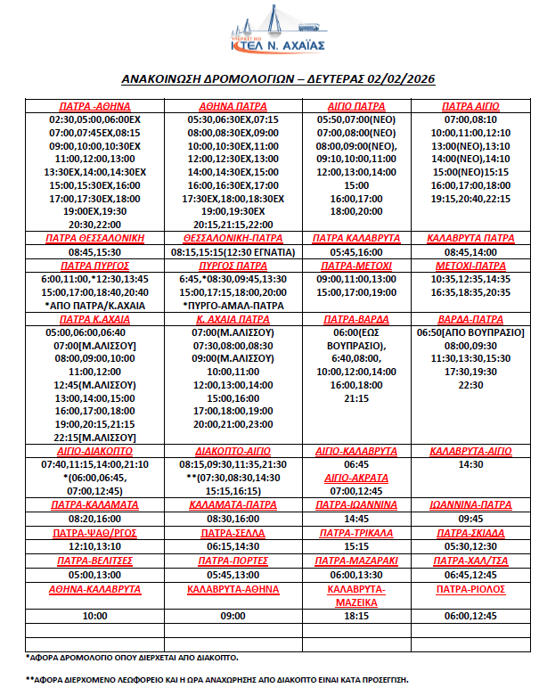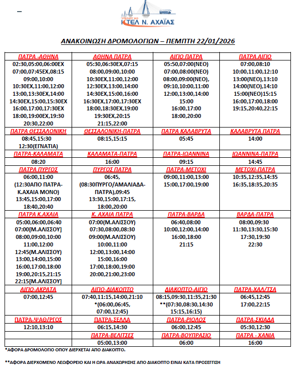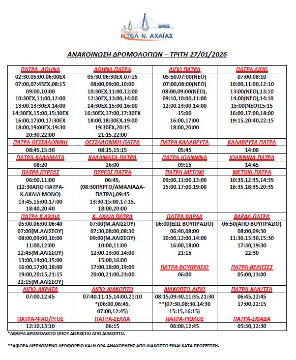 * Τα δρομολόγια express (Πάτρα-Αθήνα, Αθήνα-Πάτρα) επανέρχονται συγκεκριμένες ώρες (βλ. καθημερινό πρόγραμμα)